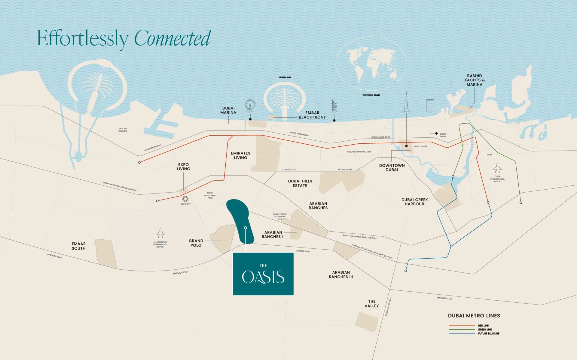 Emaar Grand Polo is strategically located in Dubai Investment Park 2 at the junction of Expo Road (E77) and Emirates Road (E611), offering seamless connectivity to Al Maktoum International Airport, Downtown Dubai, Dubai Marina and key lifestyle hubs while nestled beside premium communities like The Oasis and The Heights.